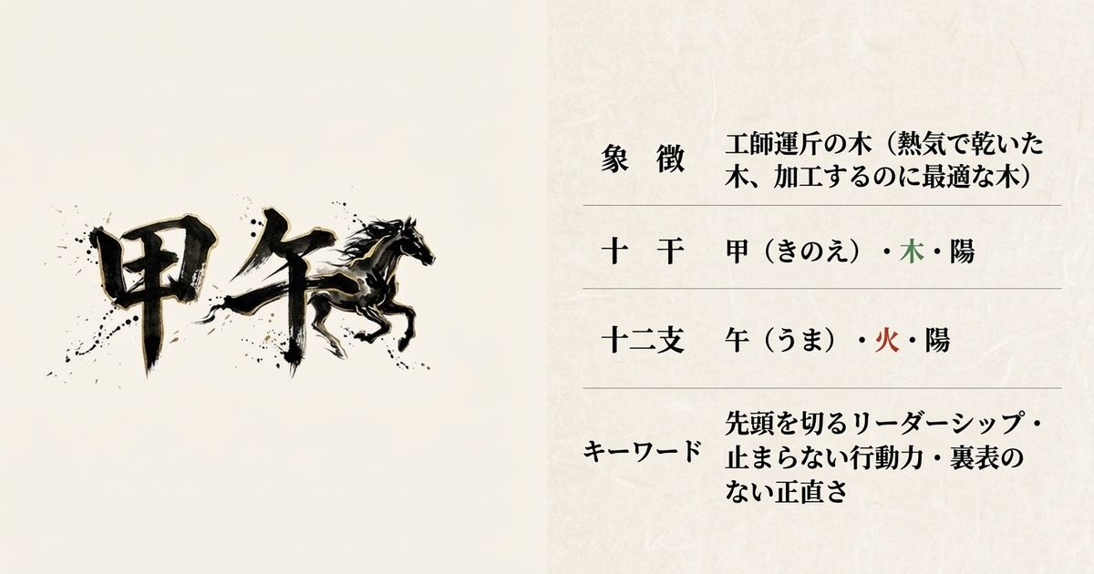 甲午は「大樹の成長力」と「駿馬の推進力」を併せ持つ干支だ。木生火の力学により、自らエネルギーを生み出しながら前進し続ける力がある。