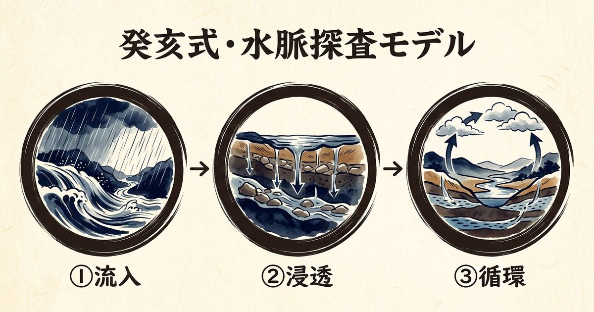 「水脈探査モデル」は、癸亥の洞察力をビジネス成果に繋げるための3段階のフレームワークだ。地下深くに眠る水脈を探し当てる作業になぞらえ、「流入」「浸透」「循環」の3つのフェーズで構成される。