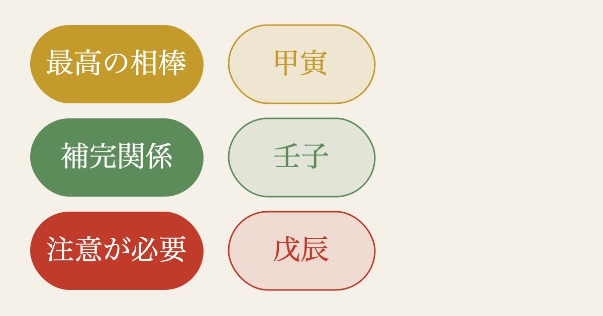 壬子(みずのえね)は同じ「水」の干支。深いレベルで理解し合える。言葉にしなくても、考えていることが伝わる。ただし、二人とも「考える」タイプなので、実行力のあるメンバーを加えるとバランスが取れる。