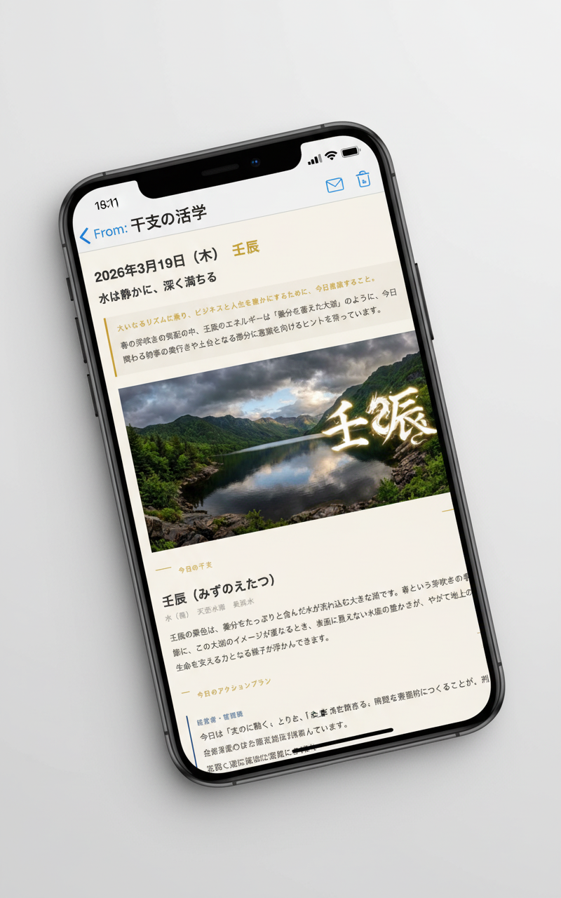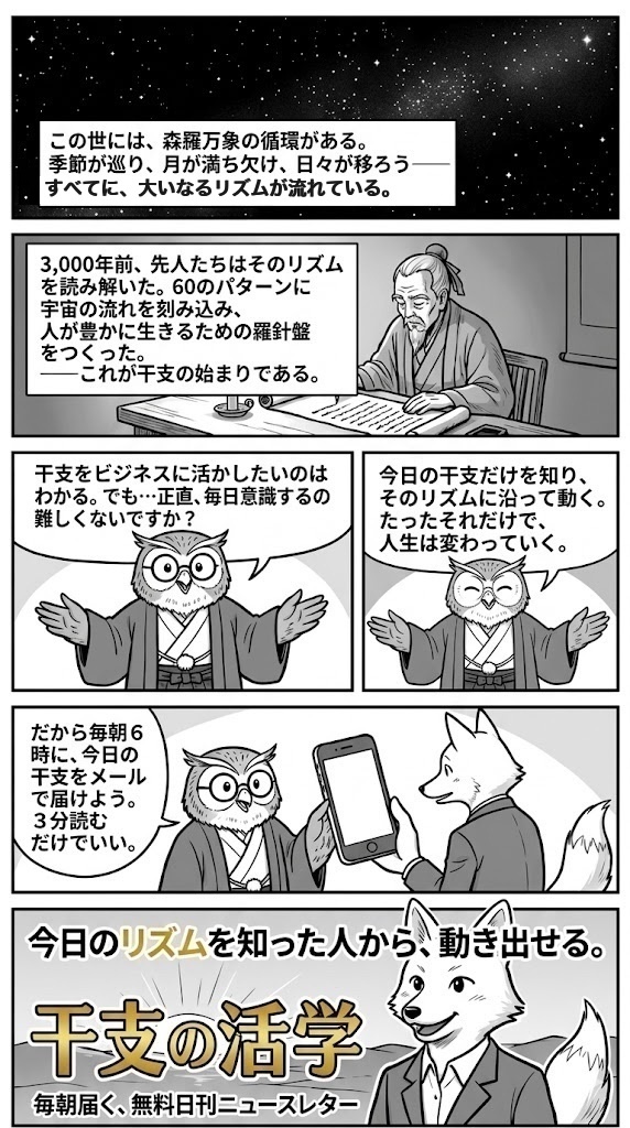 干支(えと)は、十干(甲・乙・丙・丁・戊・己・庚・辛・壬・癸)と 十二支(子・丑・寅・卯・辰・巳・午・未・申・酉・戌・亥)が 組み合わさった60種類のサイクルです。 古代中国から3,000年以上にわたり、 帝王・将軍・商人が意思決定の指針として活用してきた 東洋哲学の実践体系であり、占いとは異なります。 干支の活学では、この60サイクルを毎日のビジネスと 日常生活に活かす方法を、毎朝6時の無料ニュースレターでお届けしています。